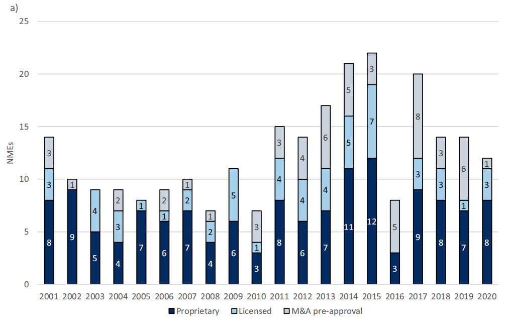 图1 每年FDA批准的NME/NTB累计数量和来源(自主研发、许可或并购获得)