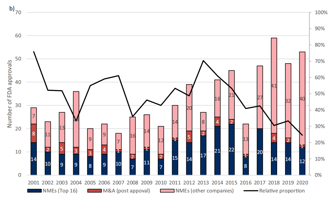 图2 16家头部制药公司样本占FDA新药批准总量的绝对和相对比例(2001-2020年)