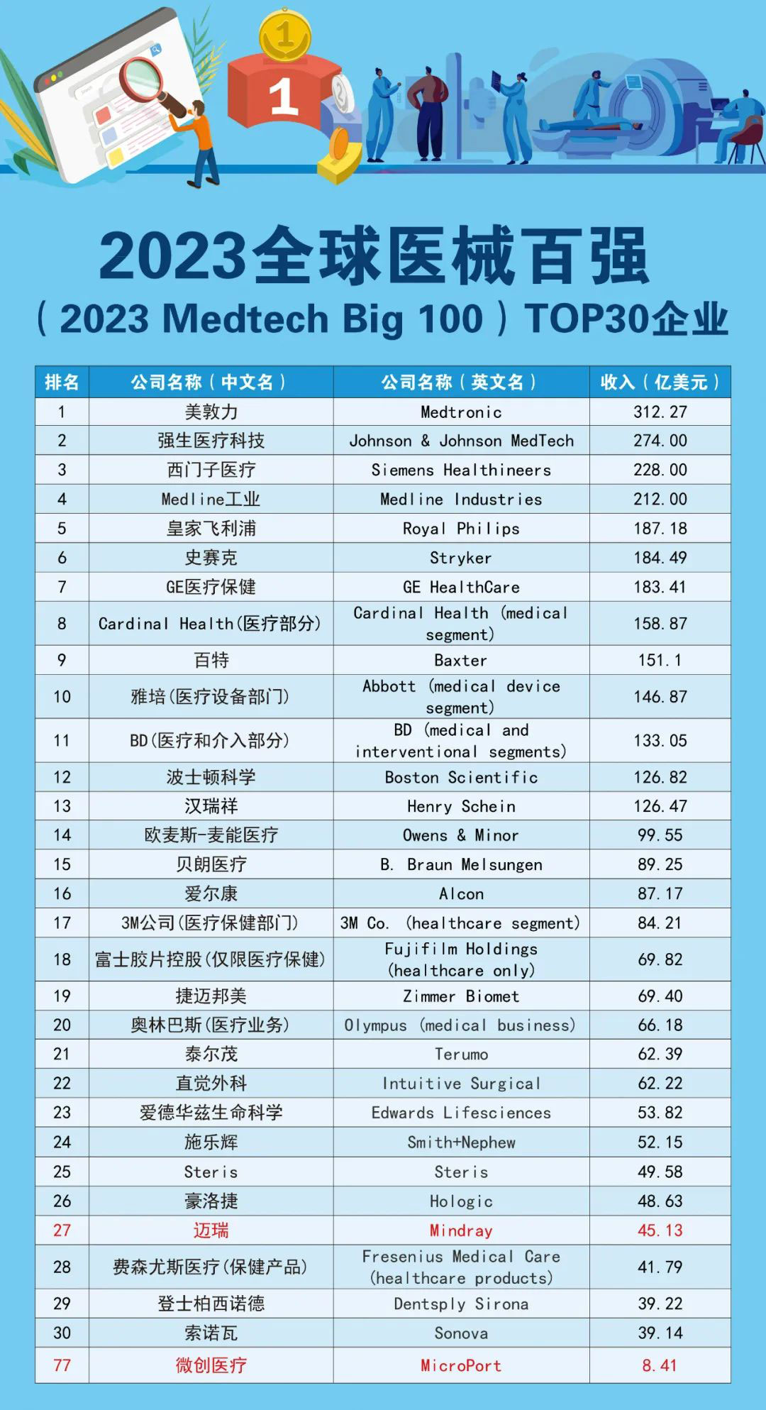 8月29日,全球医疗器械行业网站Medical design and outsourcing发布最新全球医疗器械公司100强榜单,根据百强公司2022财年营收排名,我国医械企业迈瑞医疗、微创医疗两家企业荣耀入榜。其中,行业龙头迈瑞医疗位列第27,首次挺进30强;微创医疗排名77位,与上年位次持平。