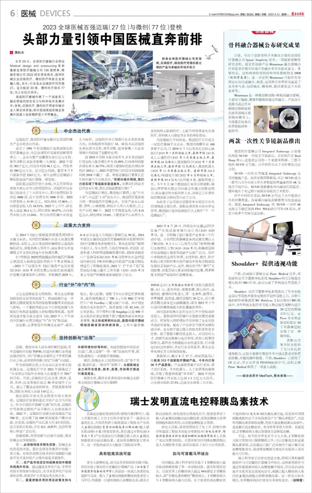 迈瑞、微创双双入围全球医械百强榜,其中迈瑞医疗站稳TOP30,对国内医械行业传递出强烈信号。国产医械企业要自立于世界医械行业之林,必须坚持创新、咬定“出海”不动摇。