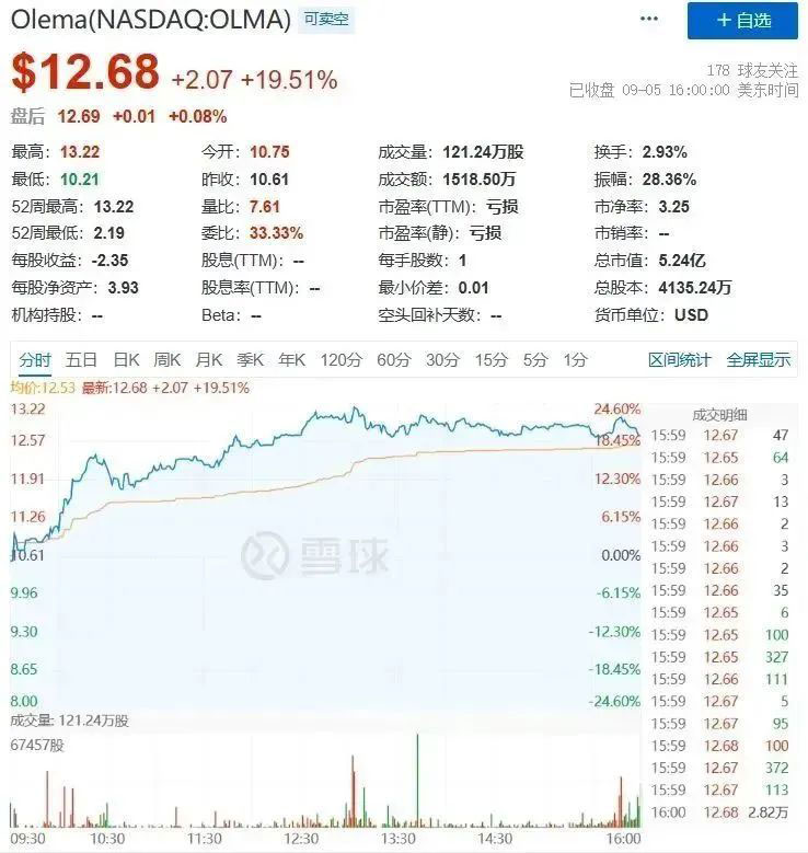 受此消息影响,Olema当日股价上涨19.51%。目前Olema股价为12.68美元/股,总市值为5.24亿美元。