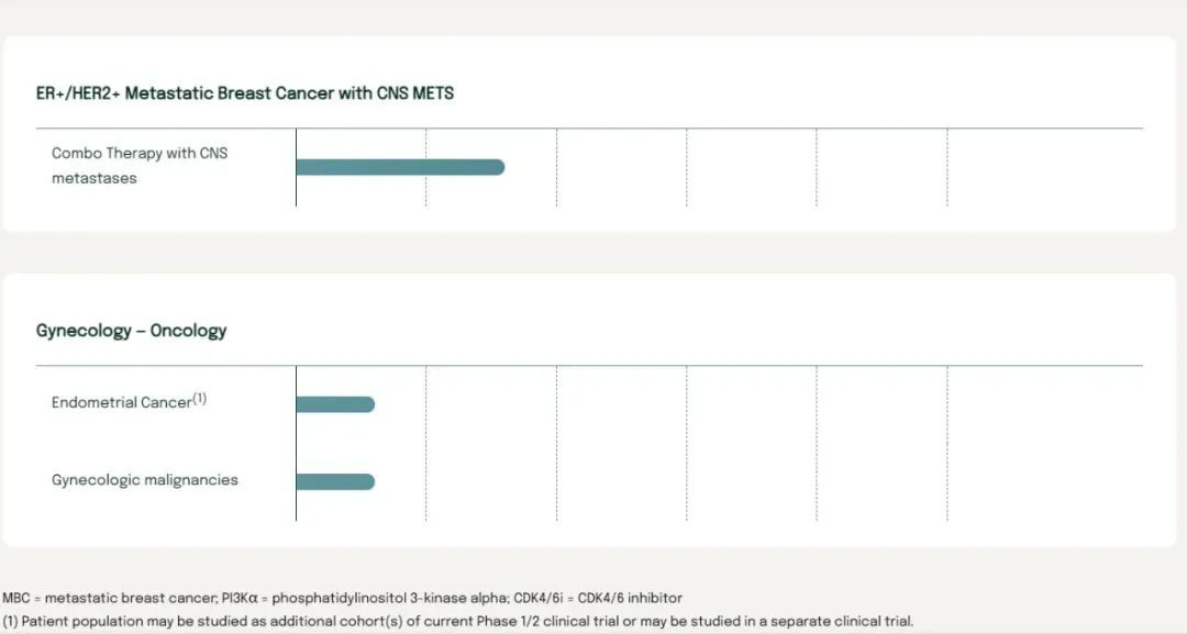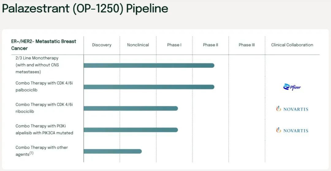 Olema将palazestrant(OP-1250)的管线布局在ER+/HER2-转移性乳腺癌、ER+/HER2+转移性乳腺癌伴中枢神经系统转移、妇科肿瘤等疾病。此外,公司还有两条处于药物发现的药物管线。