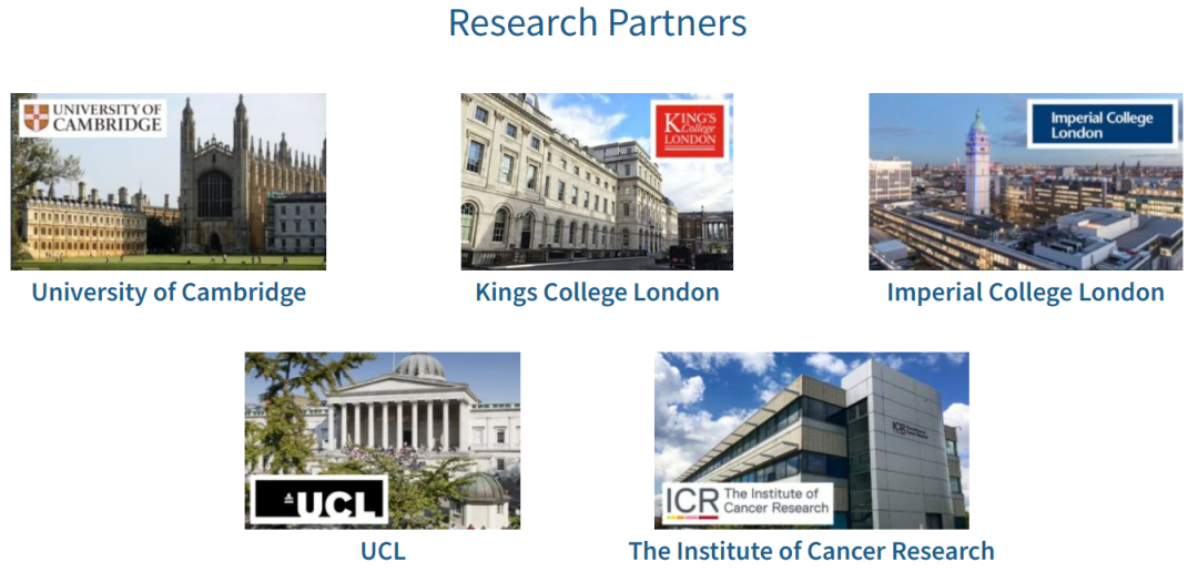 目前的合作机构有:剑桥大学、伦敦帝国理工学院、伦敦大学学院、伦敦国王学院和癌症研究所。