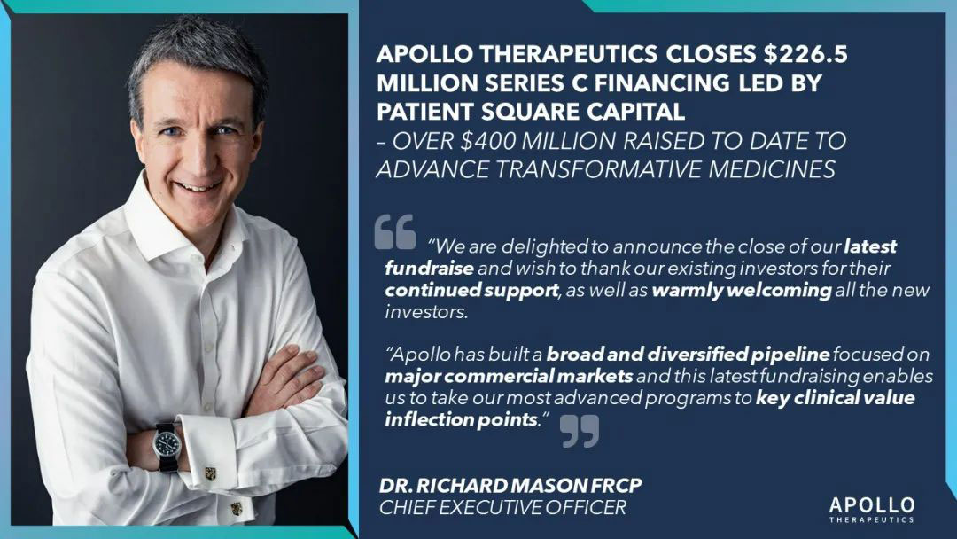 Patient Square Capital管理合伙人Jim Momtazee说:“长期以来,我一直相信药物开发的商业模式,其特点是极具才华的管理、足够的资本来追求多个项目,以及专注于未满足医疗需求的世界级科学。我们很自豪能够支持Apollo,因为它开发了许多有前景的药物,我们预计这些药物最终将改变患者护理。”