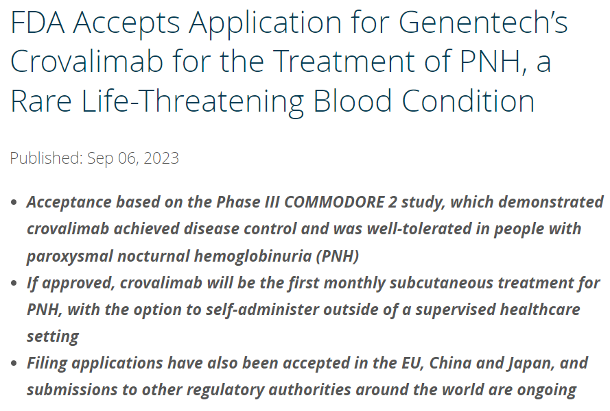 此前,罗氏已完成了珂罗利单抗用于治疗中国PNH患者的一项III期研究(COMMODORE 3),且基于该研究结果已于2022年8月在中国提交该产品的上市申请并获优先审评。