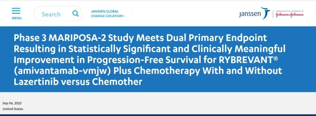 2023年9月6日,杨森宣布其肿瘤产品Amivanatamab的一项III期临床试验(MARIPOSA-2)达到主要研究终点PFS。
