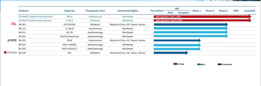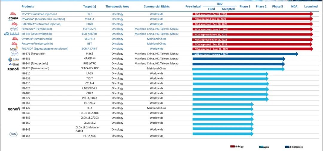 至此,信达生物已有10款产品获批上市,包括:信迪利单抗(达伯舒)、贝伐珠单抗(达攸同)、阿达木单抗(苏立信)、利妥昔单抗(达伯华)、佩米替尼(达伯坦)、奥雷巴替尼(耐立克)、雷莫西尤单抗(希冉择)、塞普替尼(睿妥)、伊基奥仑赛注射液(福可苏)以及托莱西单抗(信必乐)。