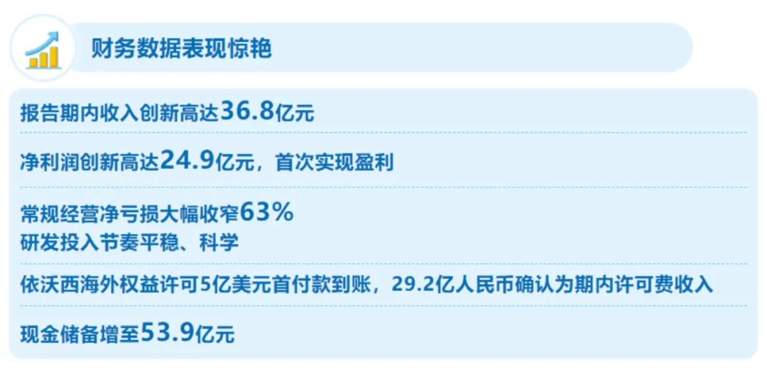 和铂医药上半年总收入约为4000万美元,同比增长约44.9%。期内盈利约200万至400万美元,而上年同期为亏损约7310万美元。值得注意的是,公司已连续两年取得半年度收入增速超过40%的良好业绩,展现了持续且突出的造血能力。公司表示,上半年总收入增加并实现扭亏为盈,主要得益于创新管线产品合作、创新技术合作推动的收入持续增长及通过运营优化所实现的降本增效。