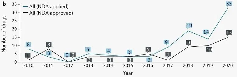 图1 | 中国创新药物的NDA申请年度数量 (来源:Nature Reviews Drug Discovery)