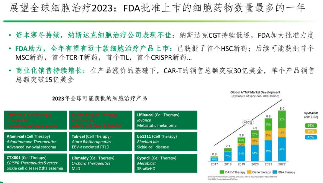 展望2023年全球细胞治疗领域,上半年已经批准了两个新的类型的产品:脐带血造血干细胞和β cell体细胞治疗的产品。下半年也有多个不同类型的产品已申报BLA申请正在等待批准,比如第一个TIL产品,第一个MSC产品,第一个TCR-T的产品,以及第一个用CRISPR技术编辑后的造血干细胞产品等。如果这些产品都能顺利的获得批准上市,有可能是FDA历史上批准细胞治疗新药数量最多和类型最多的一年。