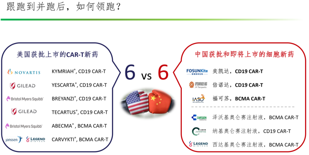 如果上面提到的3个CAR-T产品都能得到批准,在CAR-T领域到今年年底中美两地的批准数量是6:6,从产品数量、靶点和适应症上就完全一致了。之后,我们中国细胞治疗人如何实现领跑,能不能率先做出新的细胞治疗新药?特别是针对中国高发疾病的新产品?这是对国内细胞治疗提出的新挑战。