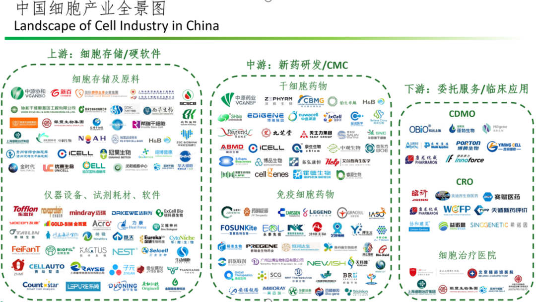 经过多年的积累,中国细胞治疗产业也逐渐形成了上图所示的一个上中下游的产业生态,给了我们后面创新的基础。以前我国细胞产业大部分聚焦在上游有现金流的细胞存储赛道。但这几年来,特别是疫情和新的国际形势影响下,无论是在降低成本,还是供应链安全等维度都带来了诸多挑战。上游也开始涌现出很多国产的设备、仪器,包括试剂耗材、软件系统等。