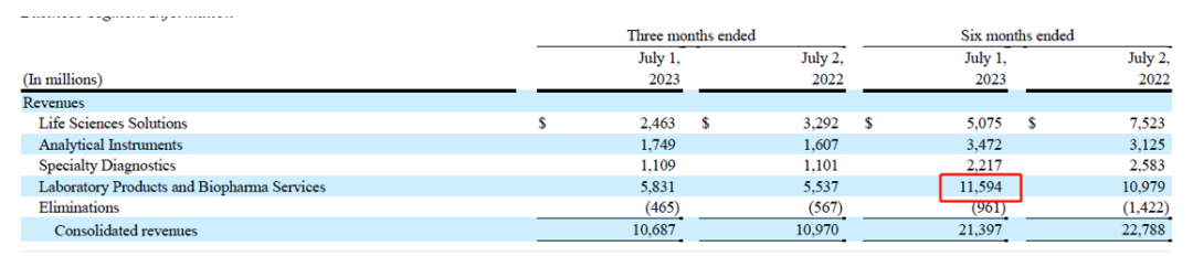 2023年上半年赛默飞世尔收入为213.97亿美元(-3.9%):其中生命科学解决方案业务收入从75.23亿美元下降至50.75亿美元(-32.5%);专业诊断业务的收入从25.83亿美元下降至22.17亿美元(-14.2%);分析仪器业务的收入从31.25亿美元增长到34.72亿美元(+11%);实验室产品和生物制药服务的收入从109.79亿美元增加到115.94亿美元(+5.6%) 。