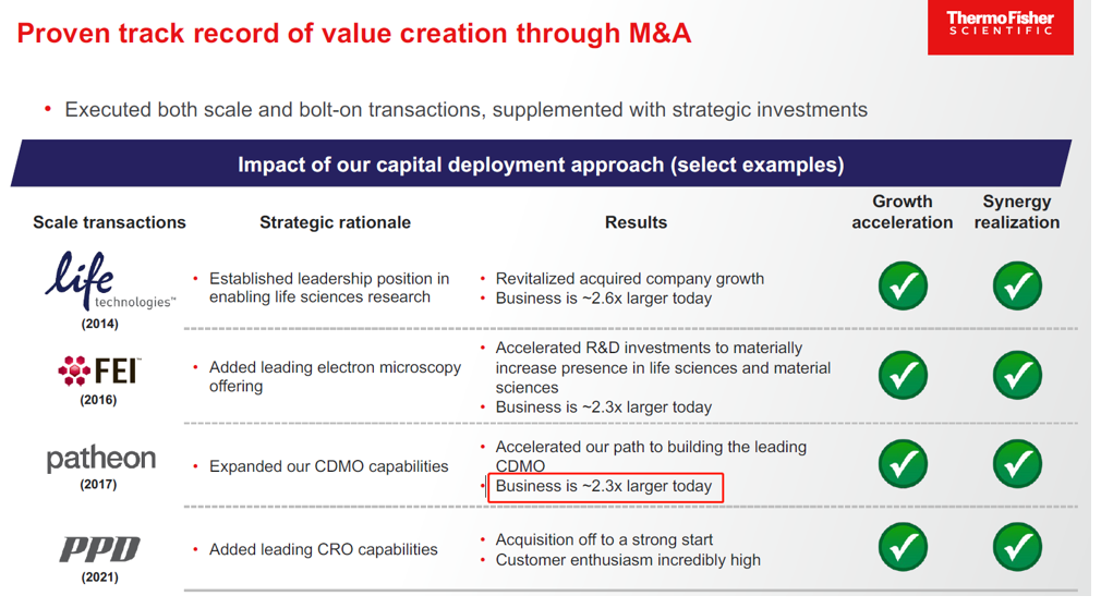 赛默飞世尔于2017年5月以72亿美元收购成本收购荷兰临床试验药物生产商Patheon NV (PTHN.N),此次收购让赛默飞进入CDMO市场;2021年4月其宣布又以174亿美元现金并承担35亿美元净债务收购国际CRO巨头PPD。