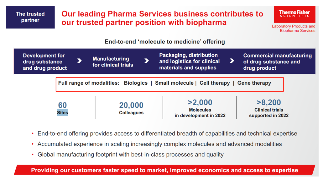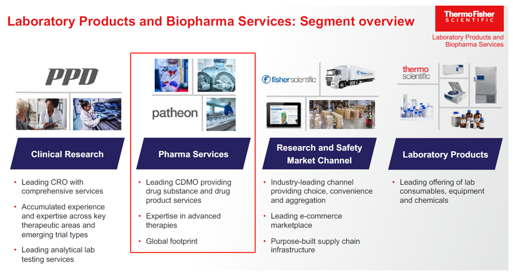 赛默飞世尔科技通过Patheon品牌,为各种规模的客户提供药物开发和商业化生产(CDMO)以及临床试验物流的制药服务解决方案。公司在全球设有超过60个办事处及30多家工厂可以在药物所有研发阶段提供包括大小分子原料药、口服及无菌制剂病毒载体服务、处方开发、临床试验解决方案、物流服务和商业化制造在内的一体化端到端服务。