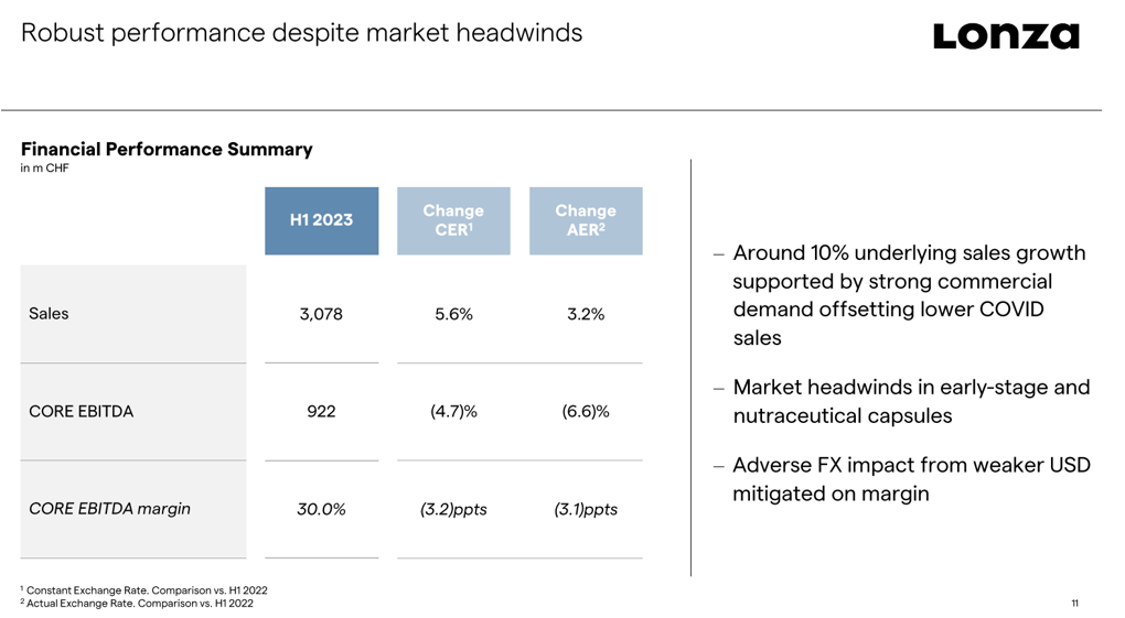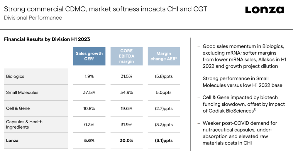 2023年上半年,龙沙(Lonza)实现了30.78亿瑞郎的销售额,按实际汇率计算增长3.2% (按固定汇率计算为5.6%),相当于约为10%的基本销售增长(按固定汇率计算);核心业务EBITDA为9.22亿瑞郎,利润率为30%。