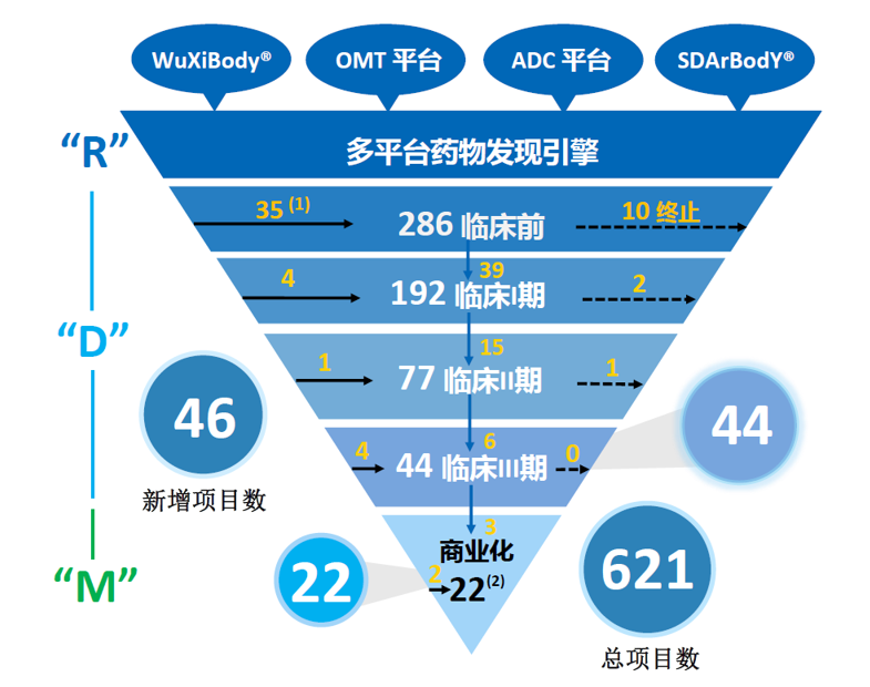 药明生物在“跟随并赢得分子”策略指引下继续保持增长,综合项目数由去年6月30日的 534 个增加至本年同期的621 个(其中新冠44个,非新冠577个),其中临床前开发项目数-0.3%至286 个,临床早期项目+32%至269 个,临床三期项目数+52%至44 个,商业化项目+57%至22 个,外部引入11 个项目,其中6 个为临床III 期和商业化项目。