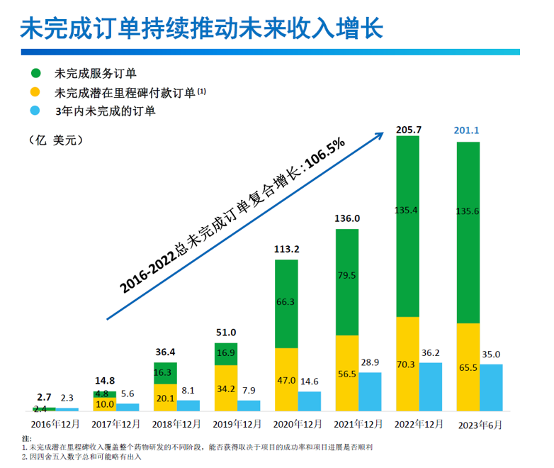 截至 2023H1 公司未完成订单总量超 201亿美元,同比增长 8.8%,其中未完成服务订单 135.6亿美元,同比增长5.88%,未完成里程碑付款订单65.5亿美元,同比增长15.69%。此外三年内未完成订单约35亿美元,能够较好的巩固近期收入增长预期。