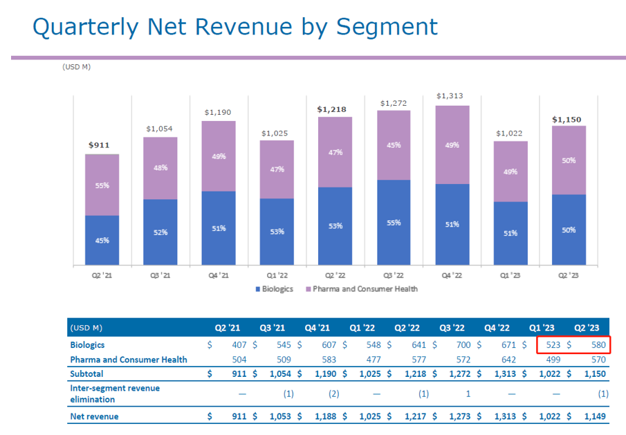 Catalent 2023年上半年收入为21.7亿美元(-3.17%),其中生物制品部门收入为11.03亿美元(-7.2%),制药和消费者健康收入为10.69亿美元(+1.2%)。