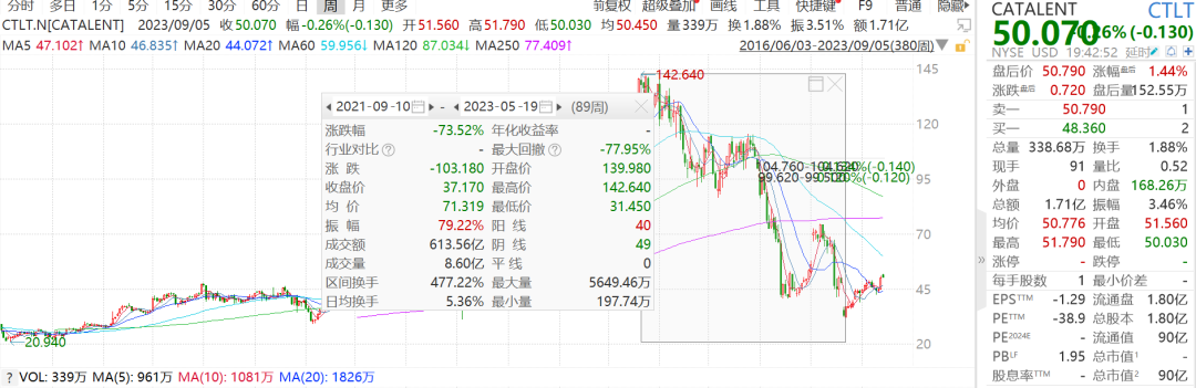 由于一连串事件的不利影响,Catalent如今的市值仅为90亿美元,几乎为2021年巅峰时期的三分之一,其股价跌幅最高曾达73.5%。