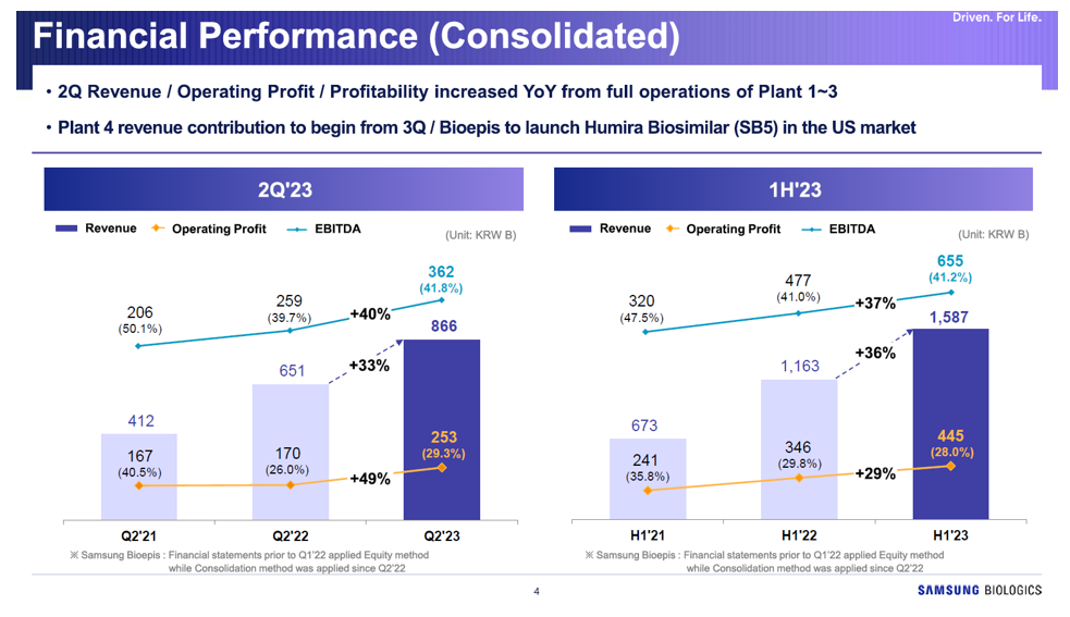 2023年上半年三星生物营收1.59万亿韩元(+36%),营业利润为4450亿韩元(+29%)。其中CDMO业务收入1.23万亿韩元(+21%),营业利润4890亿韩元(+40%)。