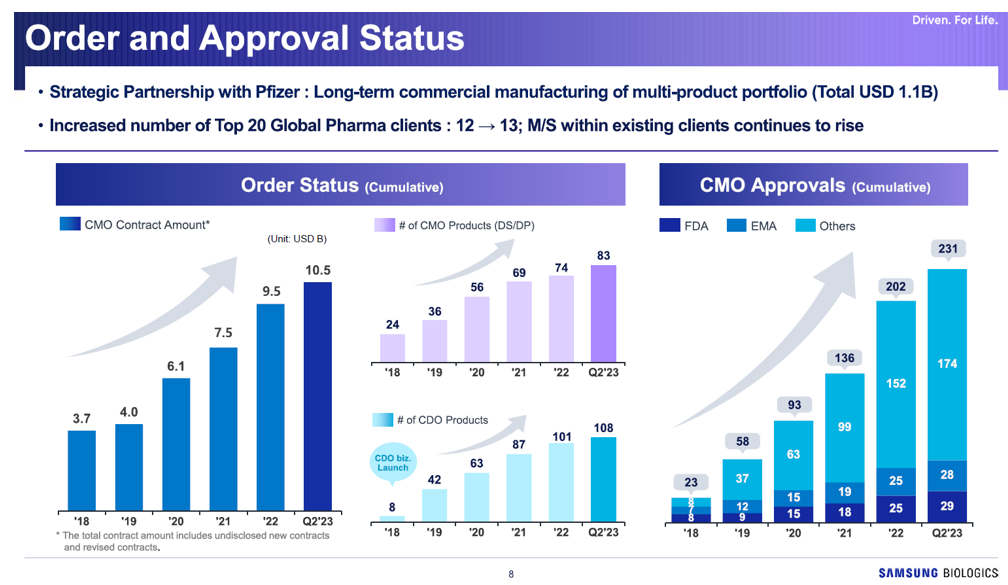 截止2023 年6 月30 日,公司的CMO 合同额相比2022 年底增长10.5%至105 亿美金,相当于2Q23 年化收入的5.3 倍(vs 2022 年的5.0 倍以及1Q23 的5.4 倍)。公司与辉瑞签署10.8 亿美元的生物类似药生产合同,与诺华签署3.9 亿美元合同,与某美国药企签署1.13 亿美元合同,与某欧洲药企签署8100 万美元合同。