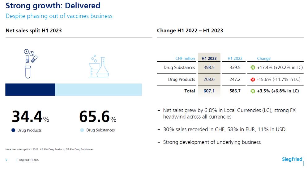 2023年上半年,Siegfried收入为6.07亿瑞士法郎(+3.5%),其中制剂业务(Drug Products)收入占比34.4%(2022年上半年占比42.1%),原料药业务(Drug Substances)收入占比65.6%(2022年上半年占比57.9%)。