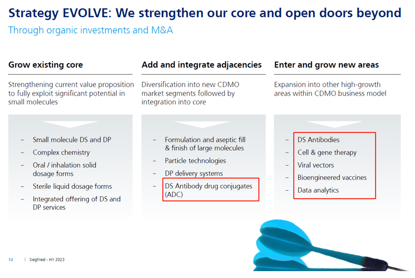 此外,Siegfried计划通过投资和并购提高自身业务多样性,从传统小分子领域逐渐进军ADC、细胞和基因治疗、病毒载体、生物工程医疗和数据分析领域,进一步抢占CDMO市场份额。
