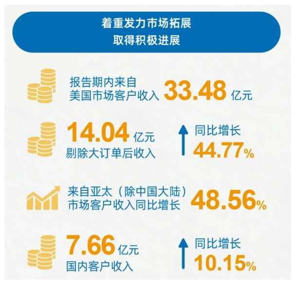 公司着重发力市场拓展,取得积极进展,报告期内来自美国市场客户收入33.48 亿元(占比达72.44%),剔除大订单后收入14.04 亿元,同比增长44.77%;来自亚太(除中国大陆)市场客户收入同比增长48.56%;国内客户收入7.66亿元,同比增长10.15%。