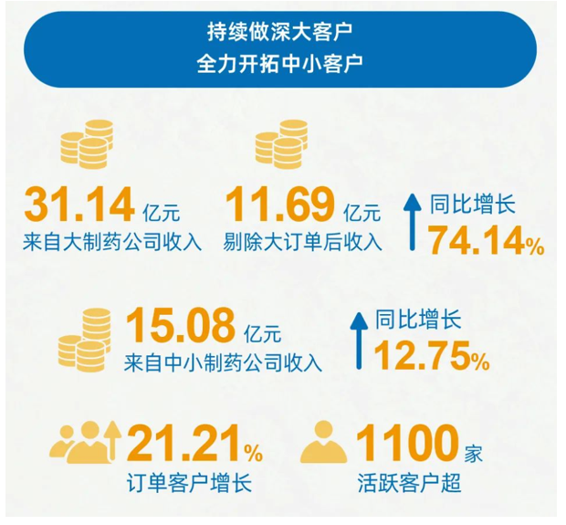 公司坚持“做深”,即大型制药公司,持续提高合作粘性和服务深度,逐渐延伸服务链条,来自大制药公司收入31.14 亿元,剔除大订单后收入11.69 亿元,同比增长74.14%;在境内外生物医药融资环境持续低迷的情况下,来自中小制药公司收入15.08 亿元,同比增长12.75%,订单客户增长21.21%,活跃客户超1100 家,持续扩大服务客户群体。