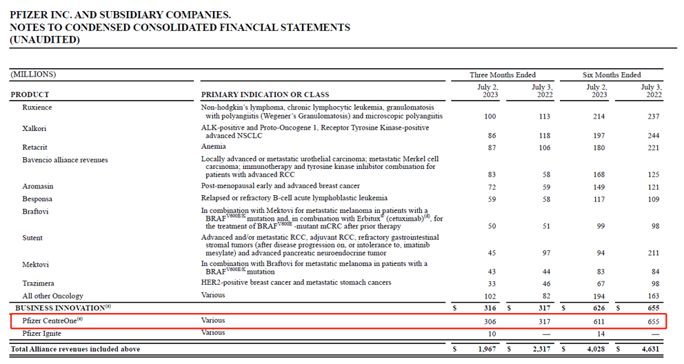 2023 年上半年辉瑞 CentreOne实现收入6.11亿美元(-6.7%),其中与BioNTech的新冠疫苗Comirnaty制造相关收入为1000万美元。