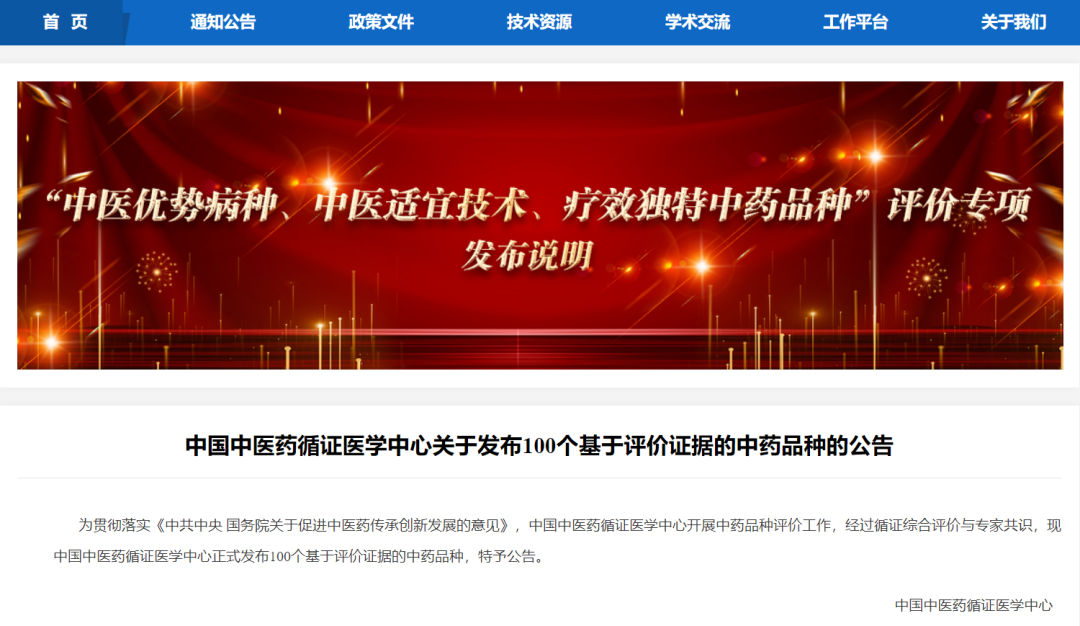 早在2019年10月,国务院发布的“关于促进中医药传承创新发展的意见”中明确提到,要求加快中医药循证医学中心建设,用3年左右时间,筛选50个中医治疗优势病种和100项适宜技术、100个疗效独特的中药品种,及时向社会发布。