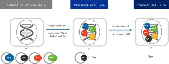 LentiVV Stable与现有主流工艺明显的不同是,将GMP质粒的应用前置到了规模化生产之前。先在小规模情况下,应用质粒系统,培育出稳定的含有全部病毒包装所需质粒“配套生产设施”的“通用细胞工厂”,确保其可以稳定传代和扩增。这种技术被称为LentiVV Packaging Cell Line,定义为LentiVV Stable的1.0版本。LentiVV Packaging Cell Line扩增后仅需和含有目的基因的单一质粒反应,就可以生产定制化的LVV,从而避免了多质粒同时混合造成的随机性。