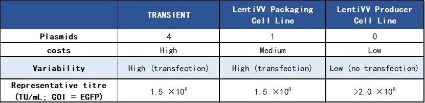▲LentiVV Packaging Cell Line、LentiVV Producer Cell Line和四质粒转染系统对比