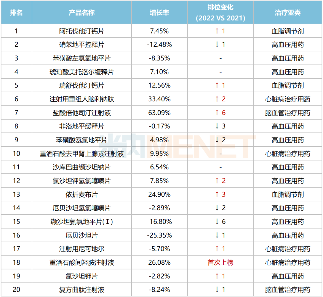 2022年中国公立医疗机构终端心脑血管系统化药TOP20产品