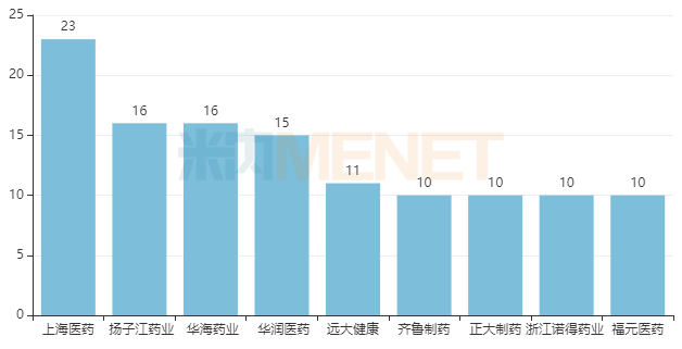从企业过评情况看,上海医药领跑,过评品种数达23个;扬子江药业、华海药业并列第二,过评品种数均达16个;华润医药以15个过评品种位列第四;远大健康以11个过评品种位列第五;齐鲁制药、正大制药、福元医药、浙江诺得药业过评品种数均达10个。