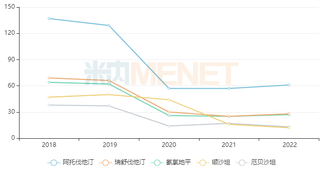4+7及扩围集采执行后,阿托伐他汀的销售额由2018年的超130亿下滑至2020年的不足60亿元,2021及2022年止跌小幅回升;瑞舒伐他汀由2018年的接近69亿元下滑至2021年的不足26亿元,2022年止跌回升;氨氯地平由2018年的超60亿下滑至2021年的不足26亿元,2022年止跌小幅回升;厄贝沙坦由2018年的超38亿元下滑至2020年的不足15亿元;第三批集采执行后,缬沙坦的销售额由2019年的接近50亿元连续下滑至2022年的不足13亿元。