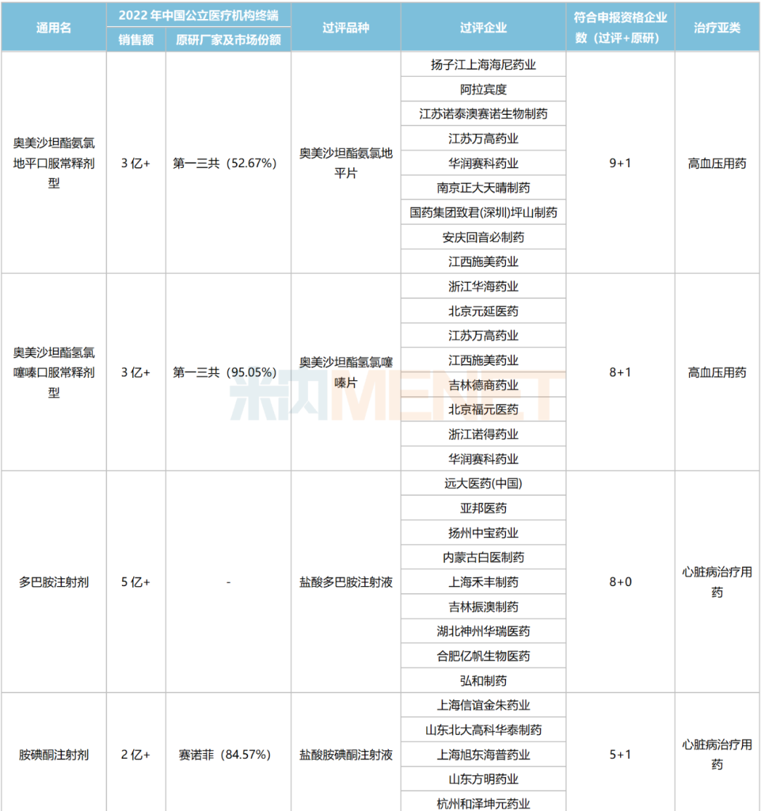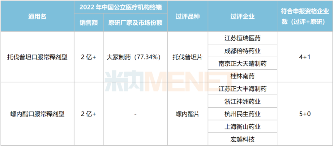 此外,目前还有2个心脑血管系统化药符合申报资格企业数达5家但暂未纳入集采,分别为托伐普坦口服常释剂型及螺内酯口服常释剂型,2个品种均属于高血压用药中的利尿剂,且2022年在中国公立医疗机构终端的销售额均超过2亿元。