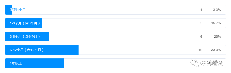 第二个问题是,“您觉得医疗反腐还会持续多久?”26.70%的企业认为1年以上,33.30%的企业认为6-12个月(含12个月),20.00%的企业认为3-6个月(含6个月),只有16.70%的企业认为1-3个月(含3个月),3.30%的企业认为,不到1个月。也就是,生物医药企业普遍认为,医疗反腐没那么快结束。