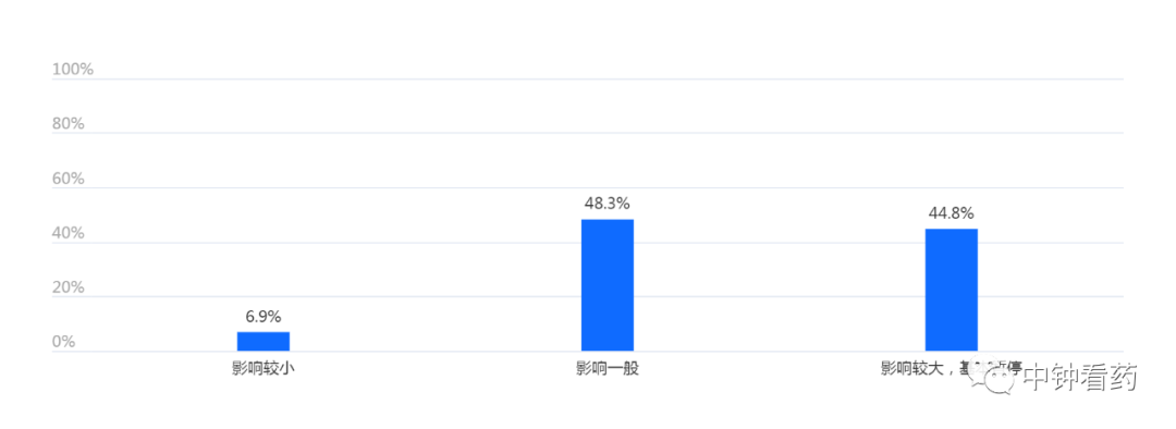 我们的第三个问题是,“您觉得医疗反腐对医院未来一年的设备采购有何影响?” 这个问题主要是针对医疗器械企业的, 44.80%的企业说,影响较大,基本暂停;48.30%的企业说,影响一般;只有6.90%的企业认为,影响较小。我们了解到,一些医疗器械企业已停止学术推广等营销活动,让营销人员在家学习。