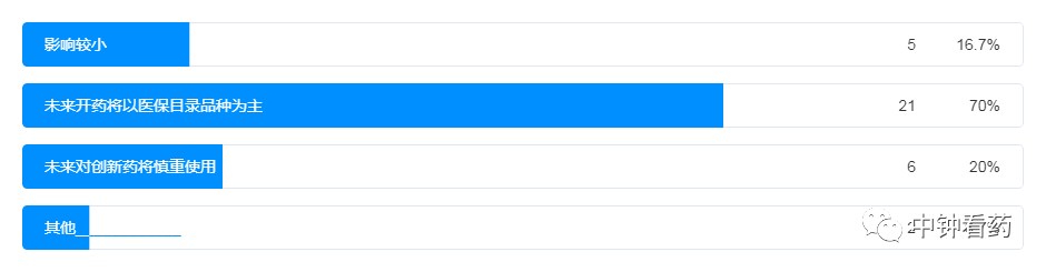 我们的第四个问题是针对制药企业的,“您觉得医疗反腐叠加医保控费对医生开具处方有何影响?” 70.00%的企业说,未来医生开药将以医保目录品种为主;20.00%的企业认为,未来医生对创新药将慎重使用;16.70%的企业表示,影响较小。