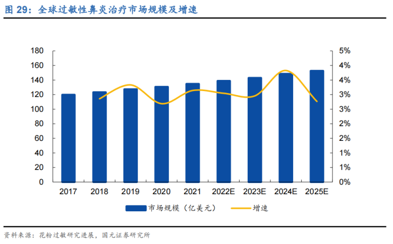 WHO数据显示:全球约有近5亿人口患有过敏性鼻炎(AR),2021年全球AR治疗市场约为135亿美元,预计2025年将达到150亿美元。