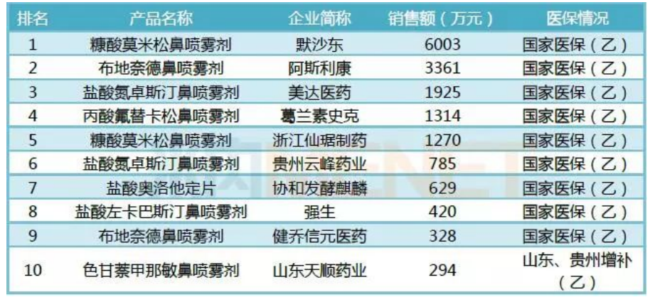 不过,从近几年过敏性鼻炎国内前三甲甚至前十的药物结构看,不仅被外资产品主导(前三甲包括:GSK的丙酸氟替卡松鼻喷雾剂、AZ的布地奈德鼻喷雾剂、MSD的糠酸莫米松鼻喷雾剂),而且以专利过期的老药为主(国内销售额十大鼻用制剂中有超过八个为专利过期药物或仿制药),创新过敏性鼻炎喷雾剂产品严重缺位。