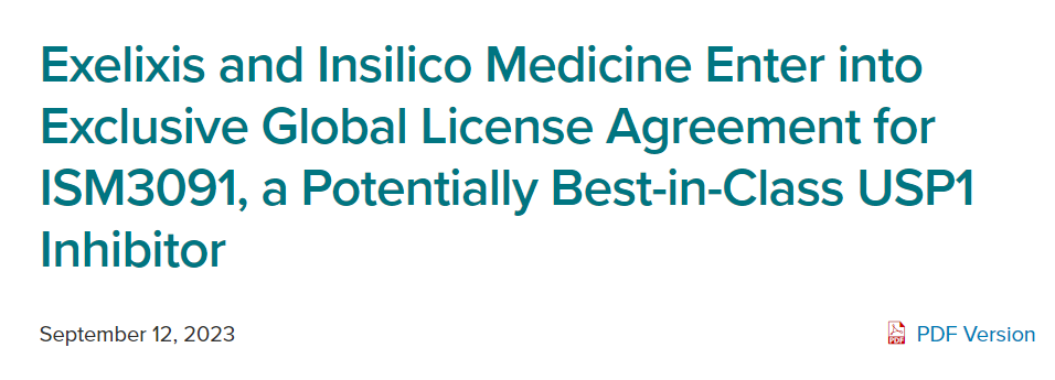 9月12日,Exelixis宣布与英矽智能(Insilico Medicine)达成独家授权协议,英矽智能授予Exelixis公司开发和商业化ISM3091的全球权利。