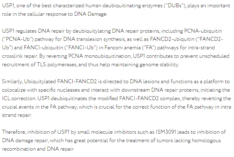 在 BRCA1m 三阴性乳腺癌(TNBC)细胞系中,ISM3091 表现出了强大抗增殖活性(IC50,20nM),对 BRCAm 和 BRCA WT 的选择性高达约 1500 倍。USP1 和 HRD 之间的合成致死性是由于持续的单泛素 PCNA 造成的。