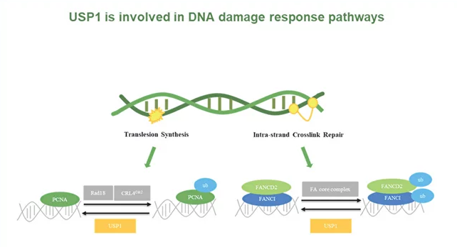 USP1在DNA损伤应答通路中发挥着重要作用,它通过使特定蛋白去泛素化,调控DNA损伤修复。