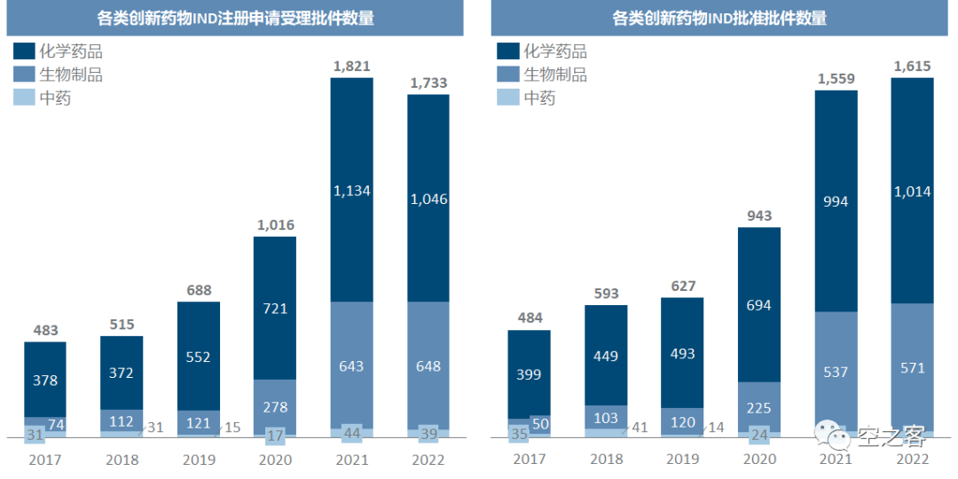 首先是IND的申请和批准的情况,可以看到从药审改革以后,创新药的临床注册和批件批准数量都出现了激增,这其中生物药尤甚、在5年内增长了十倍左右;2022年受到医药行业融资环境的影响,不少企业都在削减开支,新增IND数量有小幅下滑,这对中短期内行业内新增产品管线的数量增速势必带来一定的压力(国内CXO赛道的压力也因此而来),但至少绝对数量上已经积累了比过去多得多的基数。