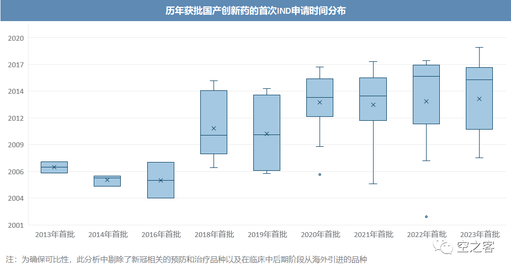 2)从临床到获批时间较短(4年内)的品种普遍更接近全球领先水平,包括PD-1、BTK、EGFR T790M等;3)药审改革前的历史包袱仍需消化时间,即使在2023年首批的品种中,依然存在大量早在2010年左右提交IND申请的老品种;4)近几年在中国医药市场大繁荣之后的增量投入,其成果多数都尚未浮出水面,目前获批品种普遍于2015年以前提交IND申请,也就可以推知其立项更是在2010年代初期,彼时国内医药行业的软硬件配置和发展环境远不比今日,甚至多数2015年后创立的新生代企业都还未进入NDA阶段,从上市品种的水平来看自然仍与全球顶尖水平有较大差距,而这种差距在早期研发端显然已经被缩小了。