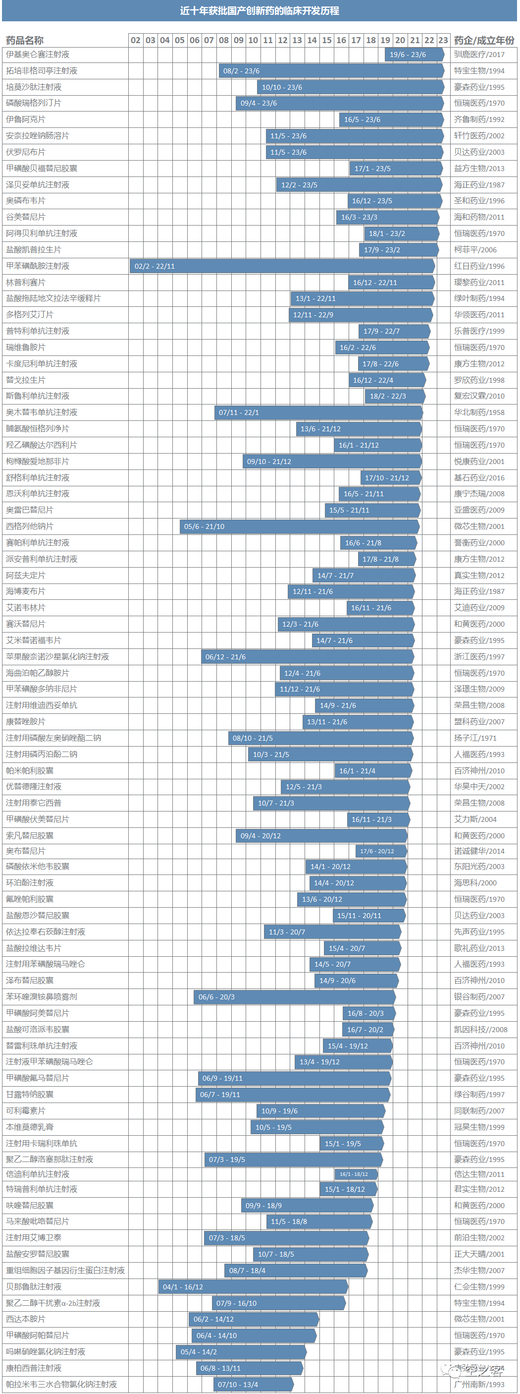 这种显著的变化趋势差异,恰恰是上述研发投入与产出成果之间滞后规律的必然呈现,我们通过逐个梳理近十年来所有获批的国产创新药的研发历程(品种清单见文末),统计其首次临床申请时间线,不难发现以下规律:1)药审改革后,研发效率显著提升,从首次临床申请到首次获批的时间差,2016年之前普遍需要10年以上、2018-2019年缩短到8年左右、近几年则已不乏5年内即可获批的案例了;