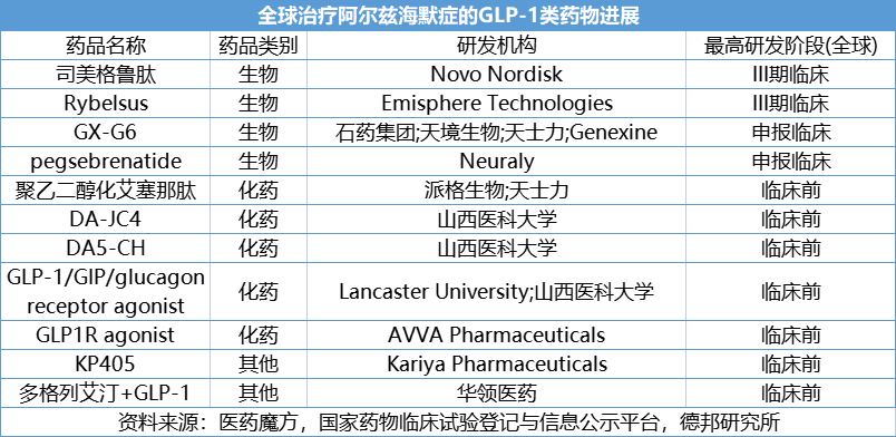 根据不完全统计,目前已经超过10家企业在GLP-1治疗阿尔兹海默症上有布局,其中既有“老面孔”司美格鲁肽,也有曾经痛失降糖市场的华领医药试图推出多格列艾汀+GLP-1的“组合拳”。